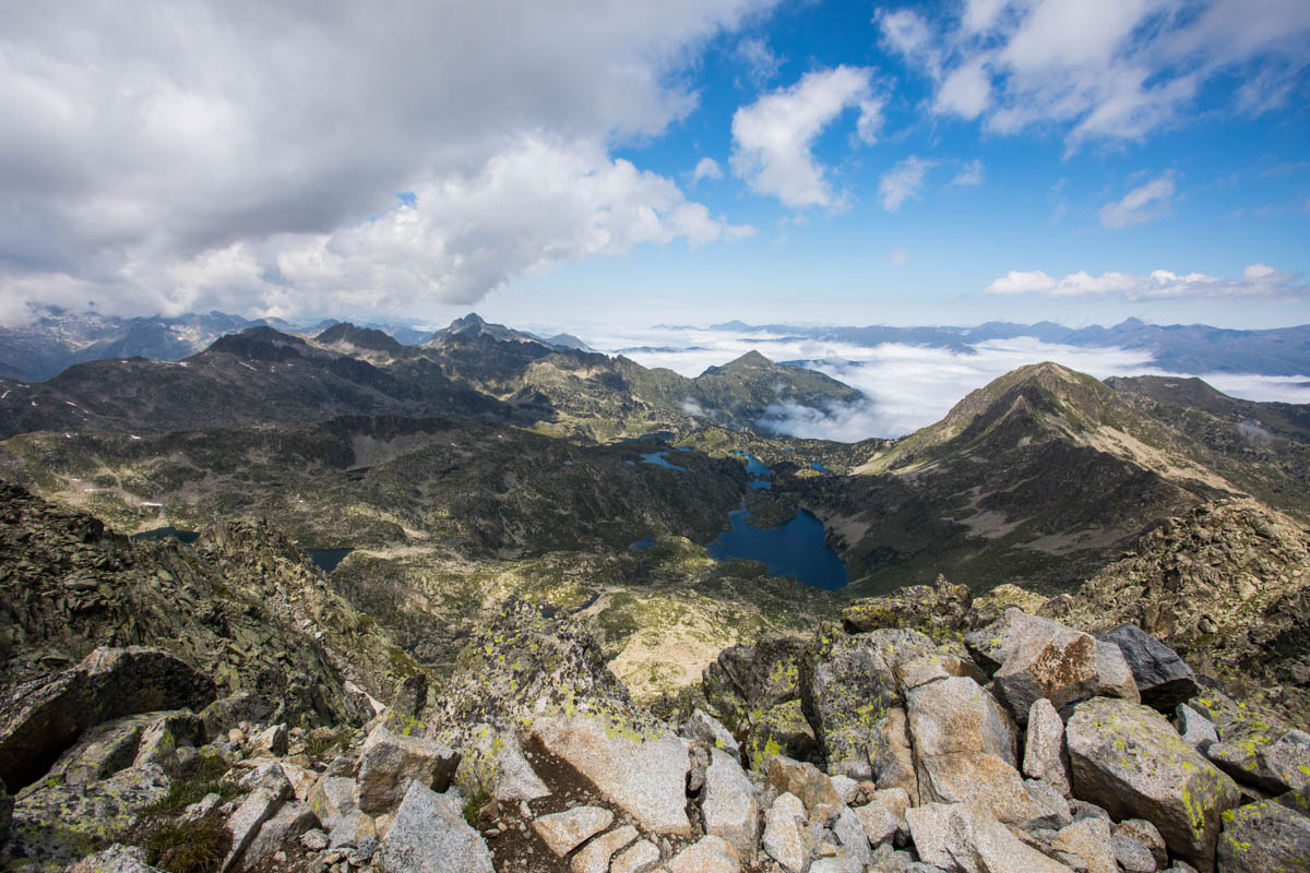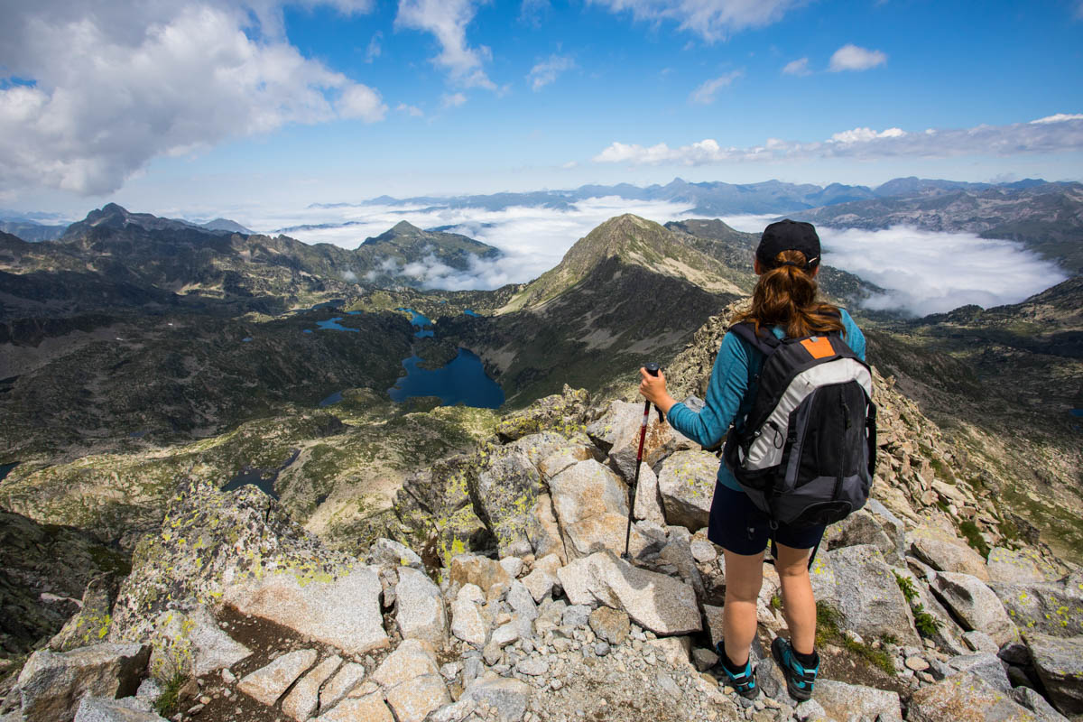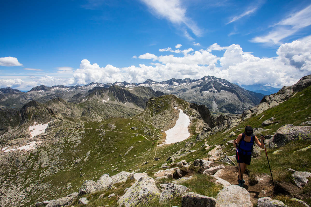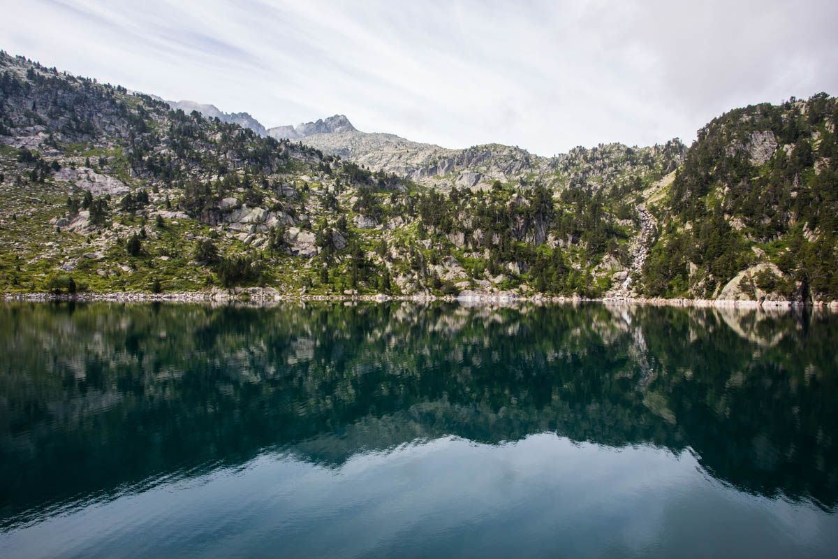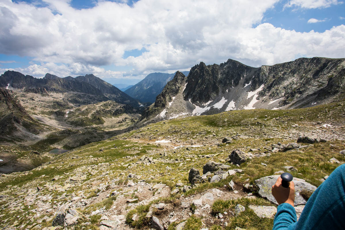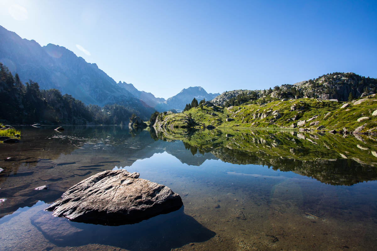 Los chicos con los que compartimos el taxi eran majísimos y se notaba que iban a por una travesía larga o una cima potente. Nosotros empezamos nuestra ruta a un ritmo más tranquilo, pero alucinando desde el primer momento con el paisaje. Todo estaba verde, vivo, de pleno verano. Prácticamente no había nadie. A lo lejos, unas nieblas entraban por el Valle de Arán, haciendo la escena aún más mágica.