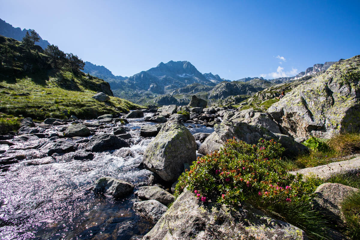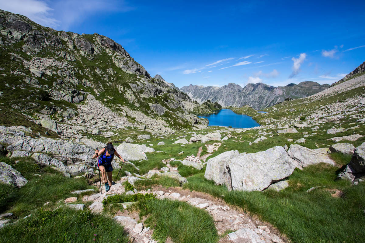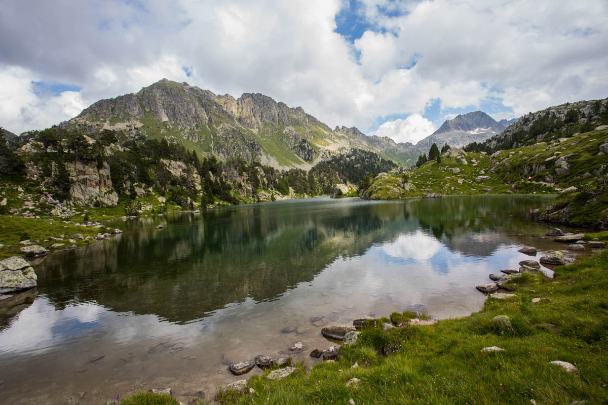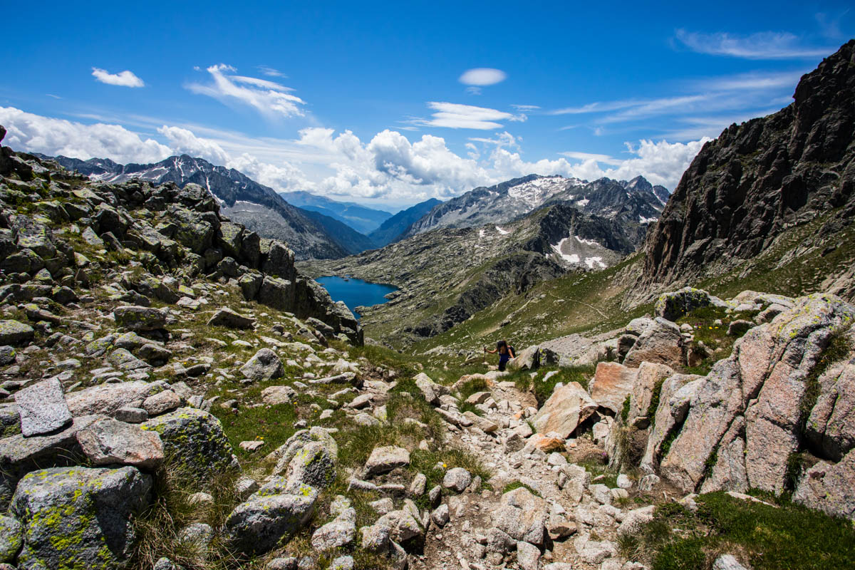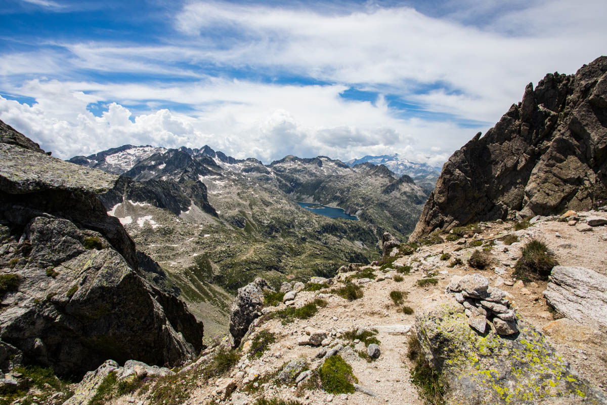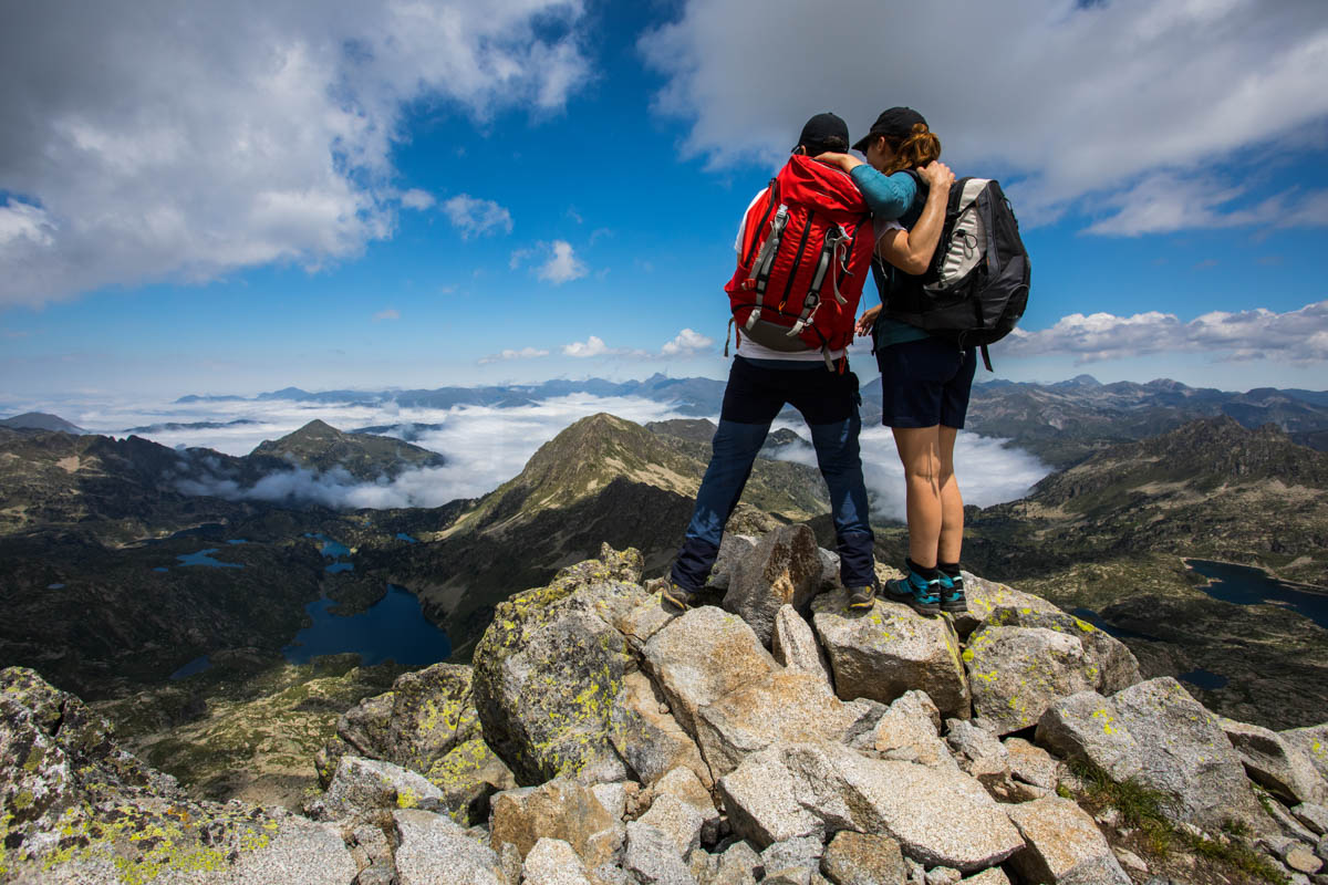 Los chicos con los que compartimos el taxi eran majísimos y se notaba que iban a por una travesía larga o una cima potente. Nosotros empezamos nuestra ruta a un ritmo más tranquilo, pero alucinando desde el primer momento con el paisaje. Todo estaba verde, vivo, de pleno verano. Prácticamente no había nadie. A lo lejos, unas nieblas entraban por el Valle de Arán, haciendo la escena aún más mágica.