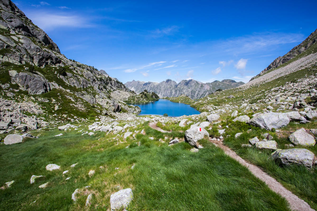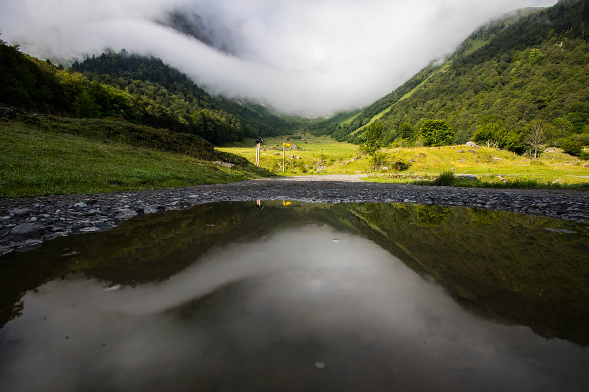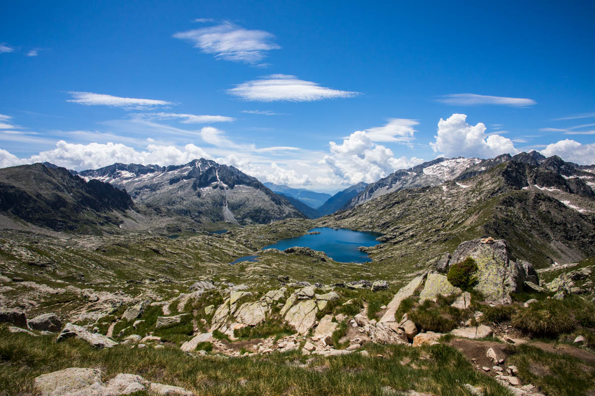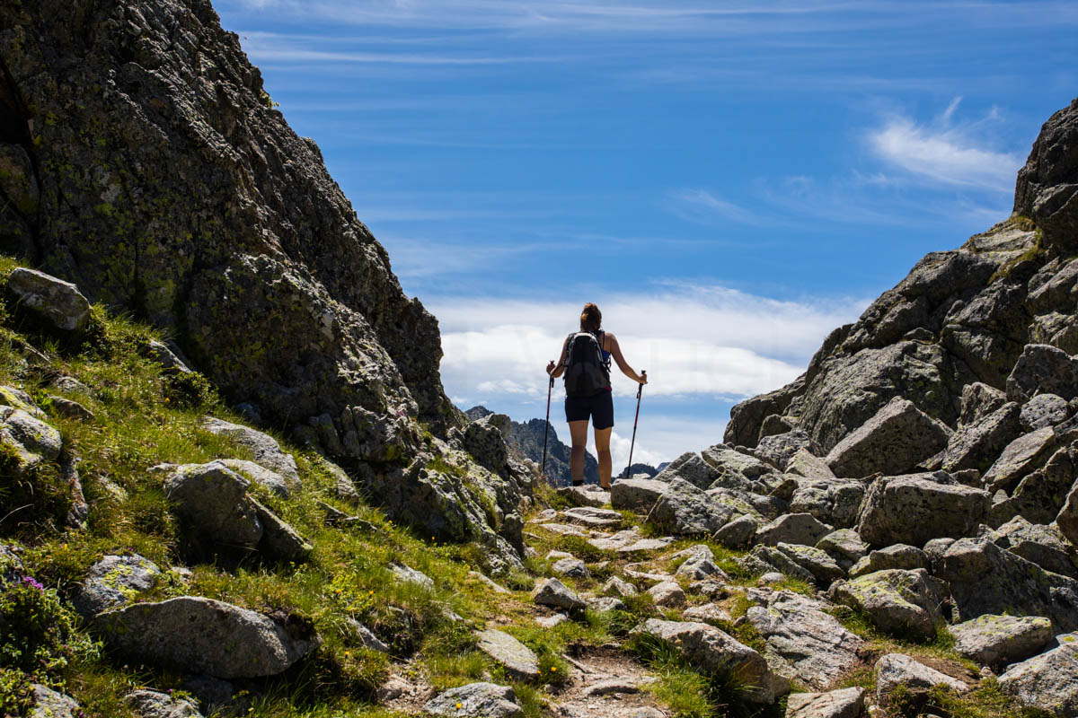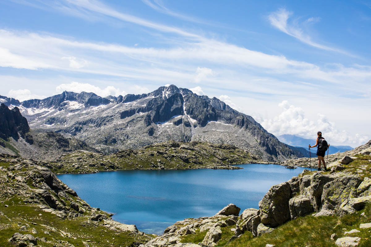 Los chicos con los que compartimos el taxi eran majísimos y se notaba que iban a por una travesía larga o una cima potente. Nosotros empezamos nuestra ruta a un ritmo más tranquilo, pero alucinando desde el primer momento con el paisaje. Todo estaba verde, vivo, de pleno verano. Prácticamente no había nadie. A lo lejos, unas nieblas entraban por el Valle de Arán, haciendo la escena aún más mágica.