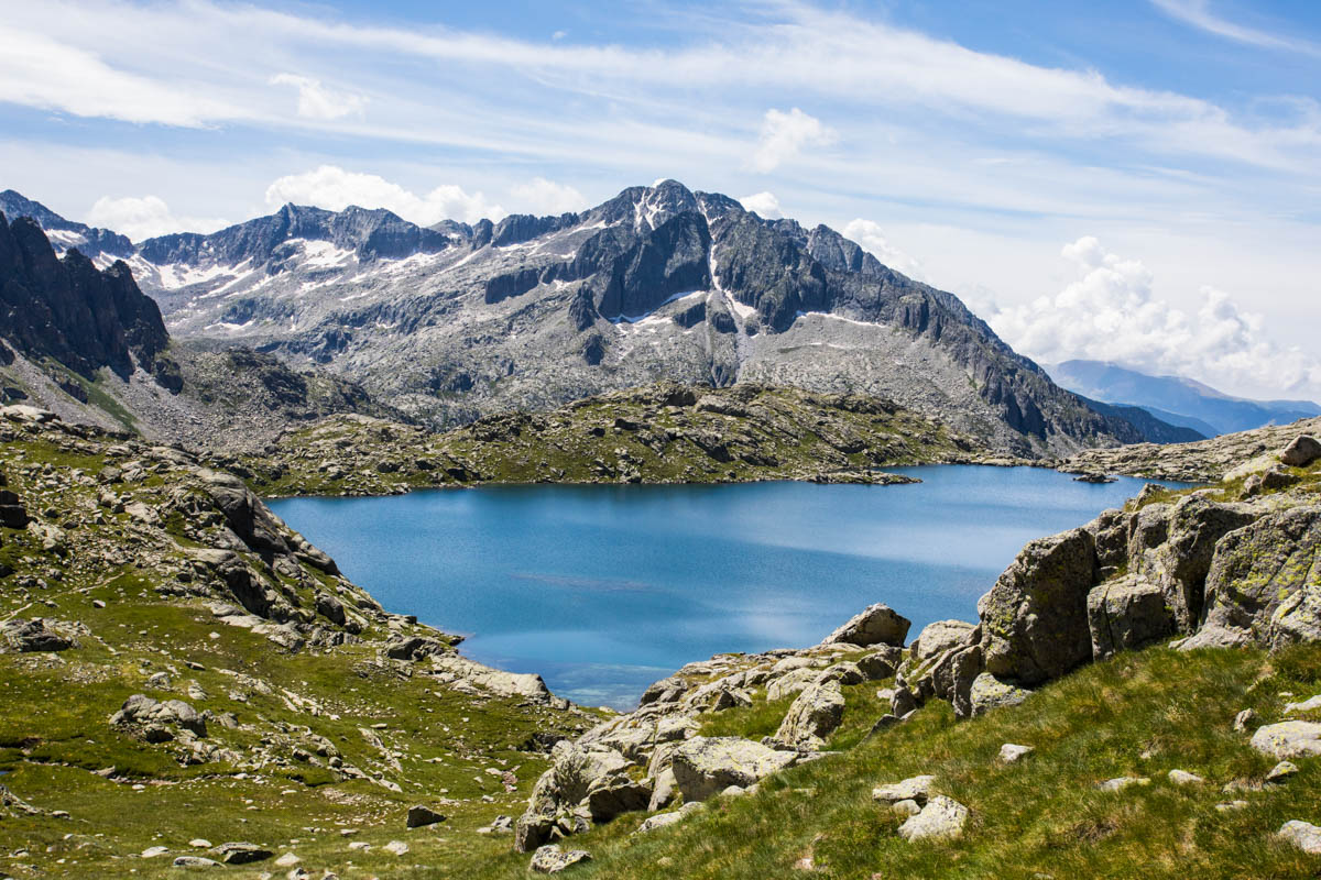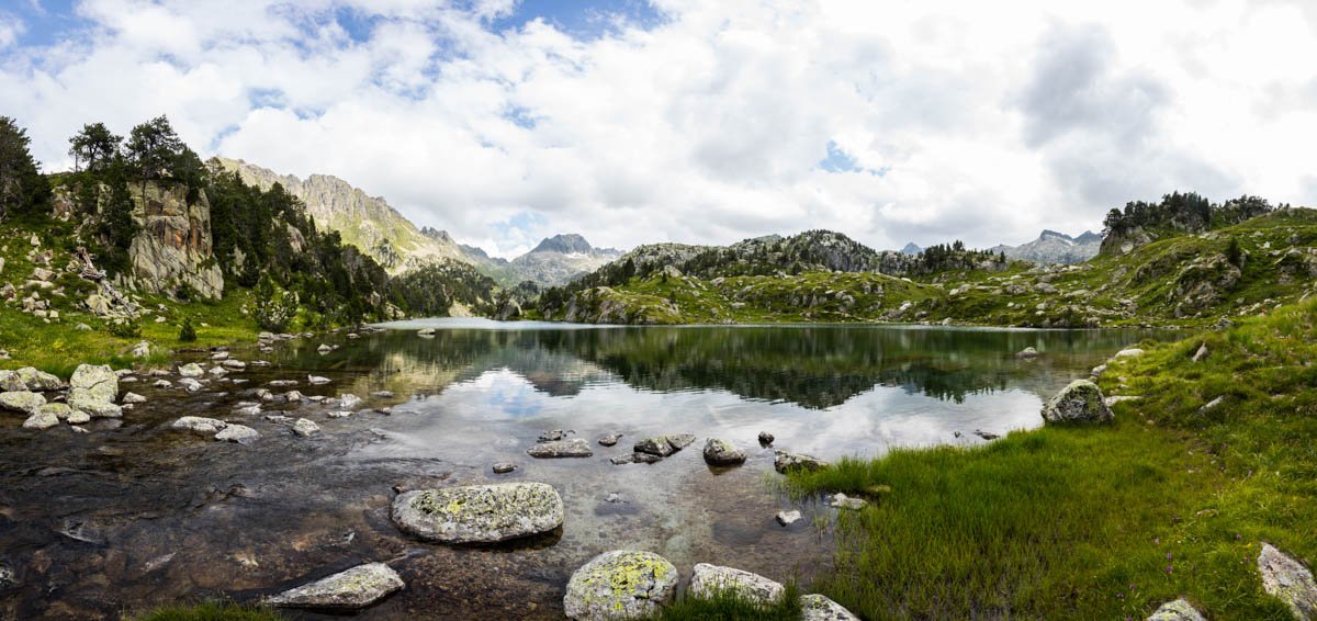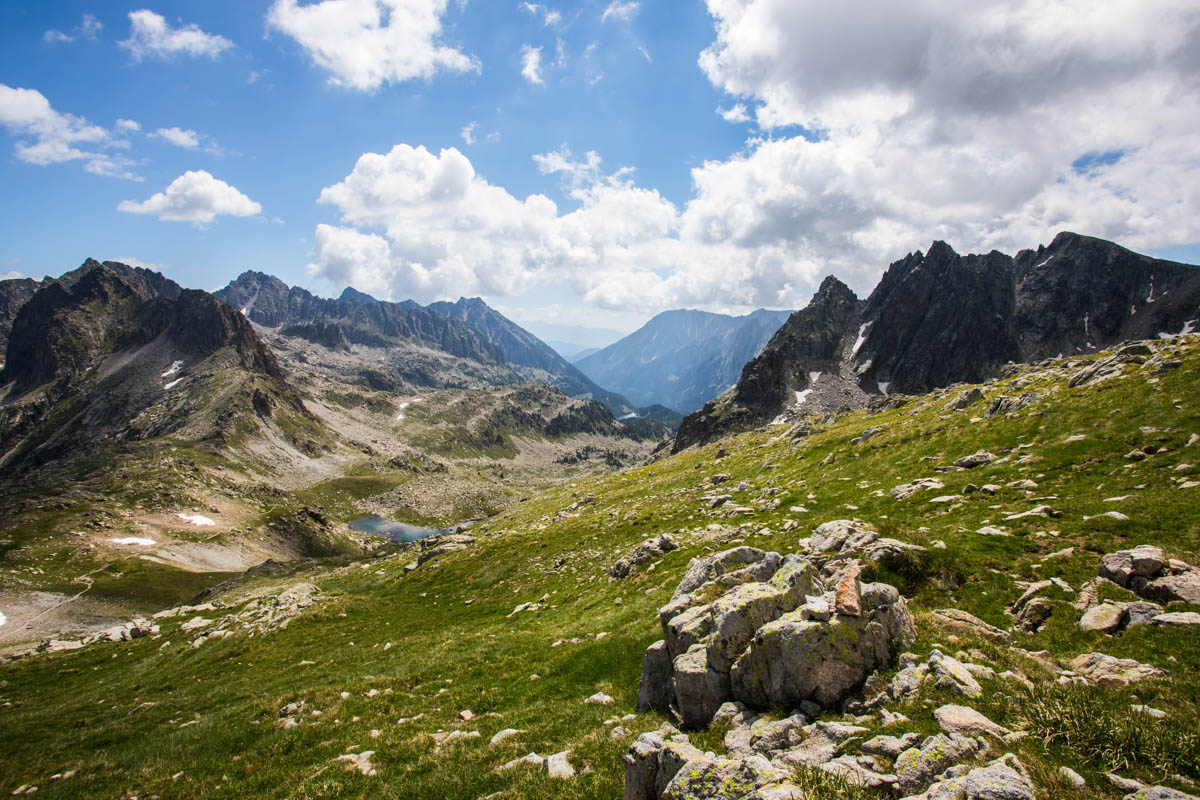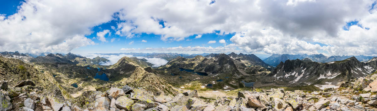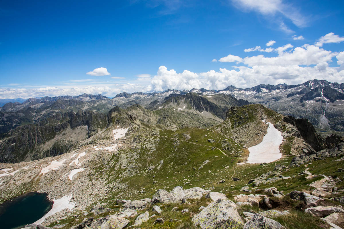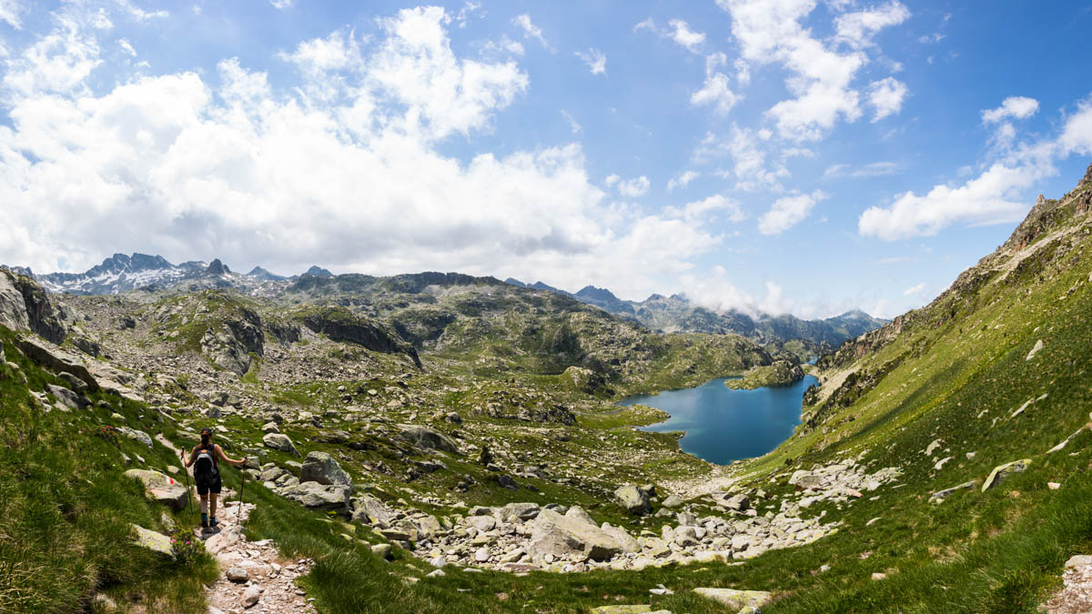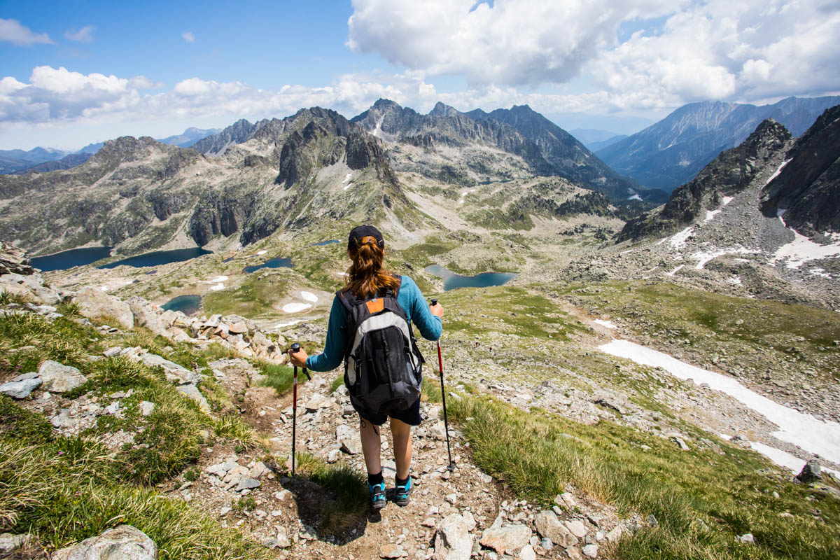 Los chicos con los que compartimos el taxi eran majísimos y se notaba que iban a por una travesía larga o una cima potente. Nosotros empezamos nuestra ruta a un ritmo más tranquilo, pero alucinando desde el primer momento con el paisaje. Todo estaba verde, vivo, de pleno verano. Prácticamente no había nadie. A lo lejos, unas nieblas entraban por el Valle de Arán, haciendo la escena aún más mágica.