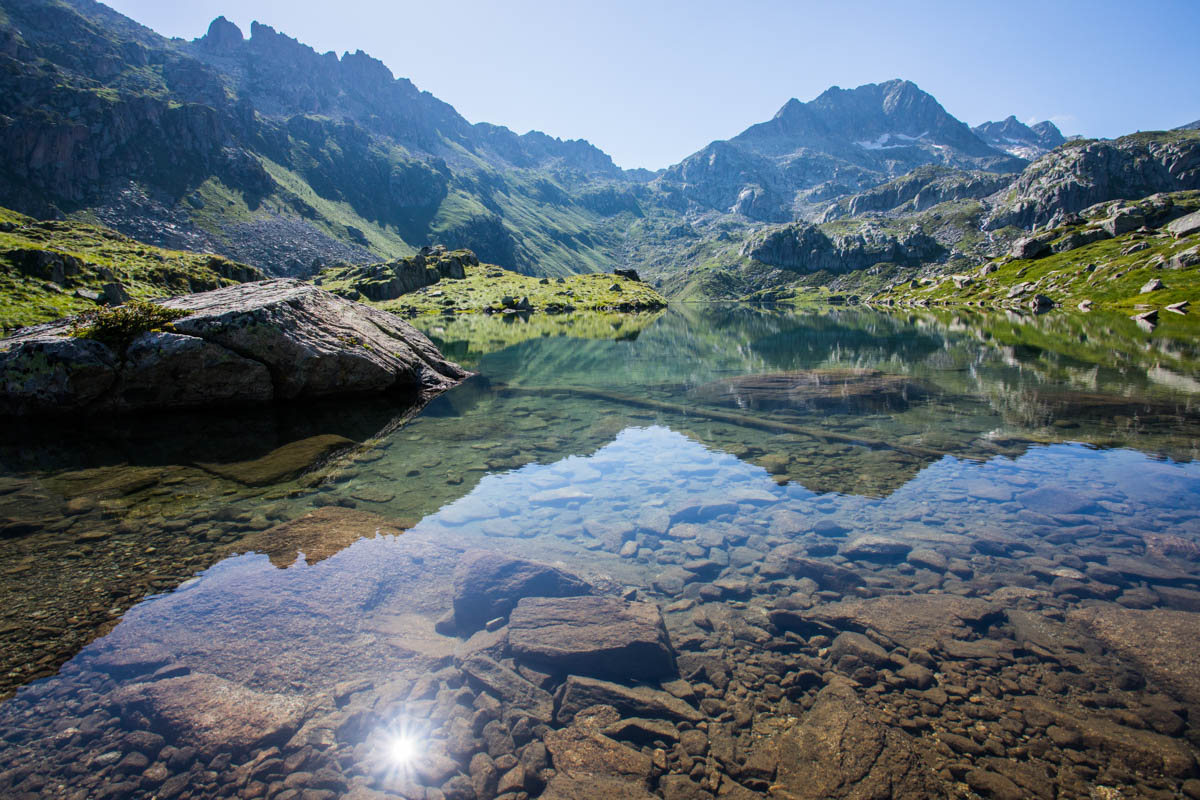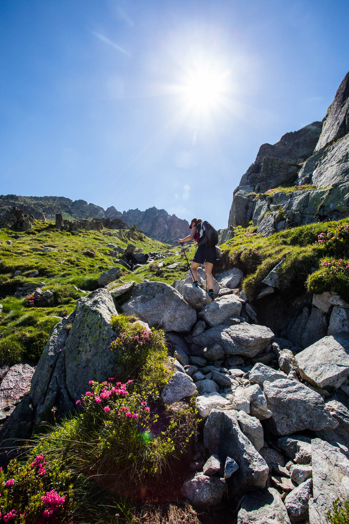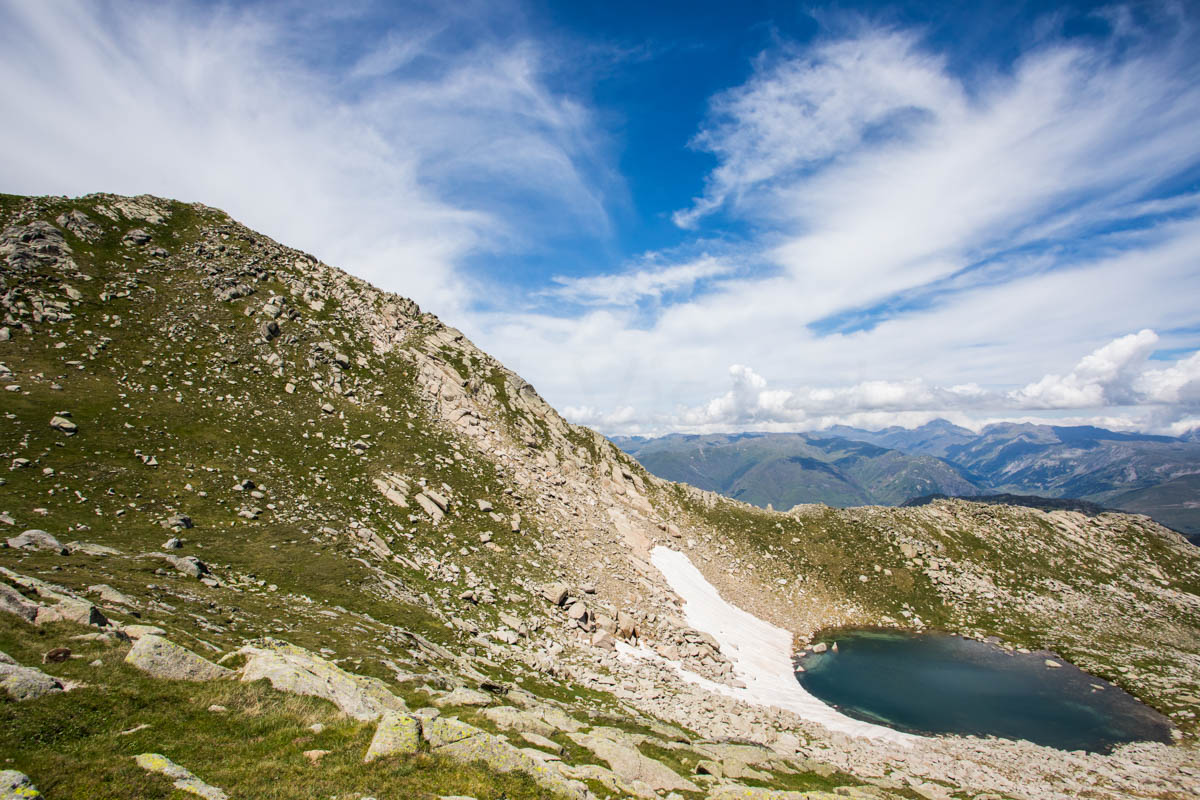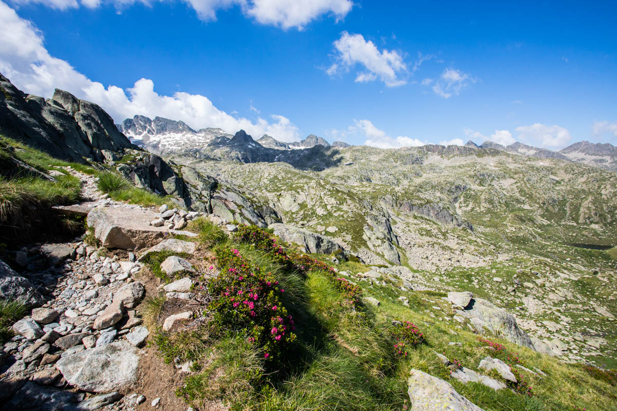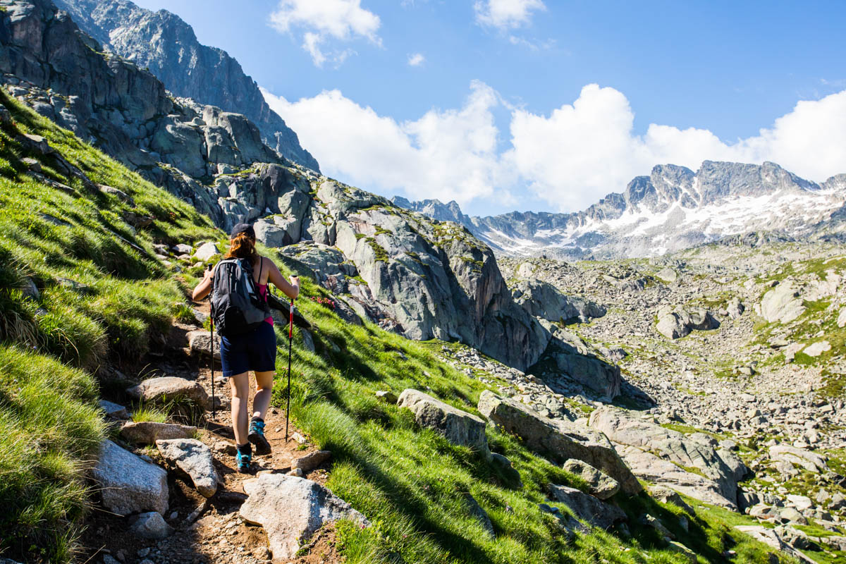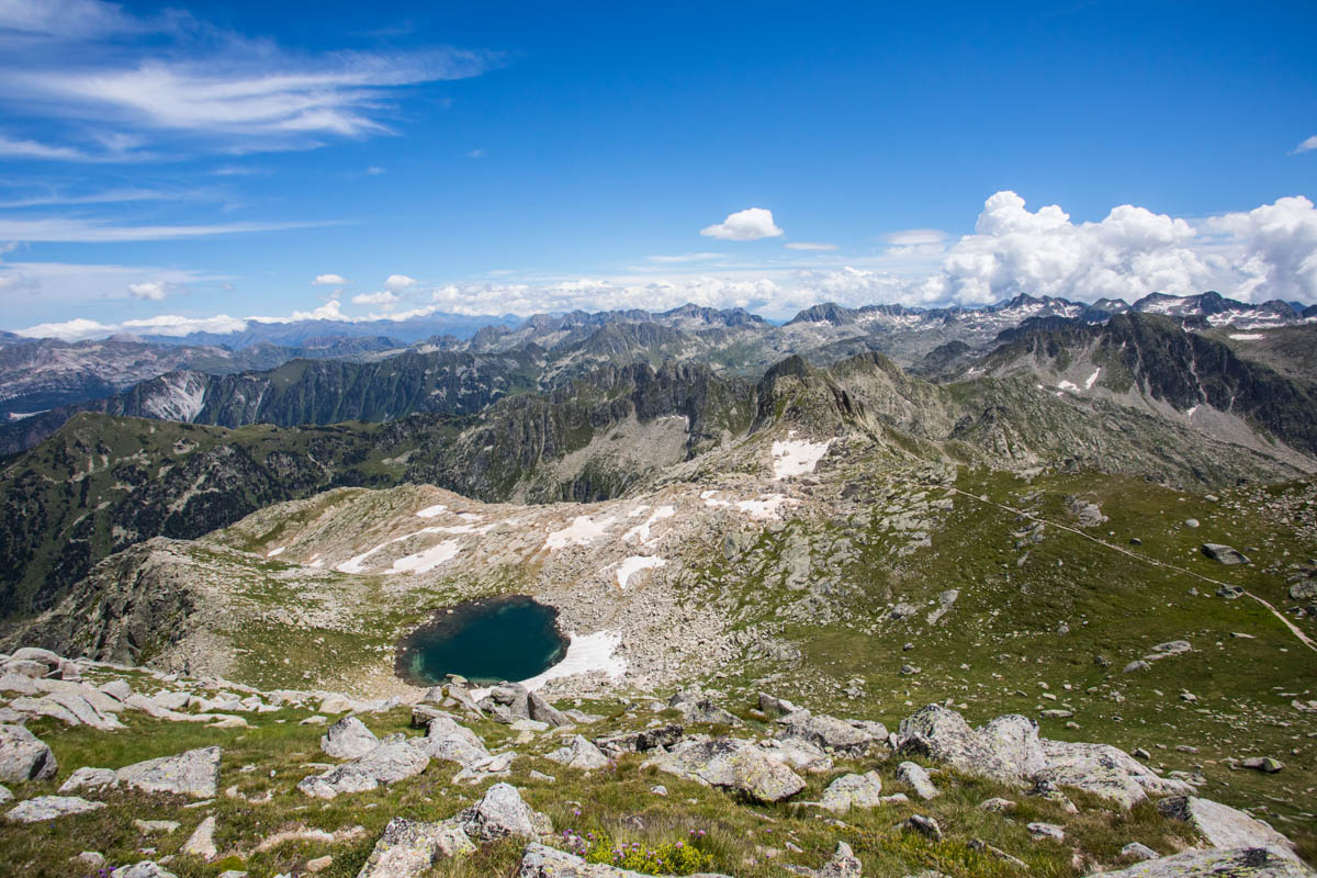 Los chicos con los que compartimos el taxi eran majísimos y se notaba que iban a por una travesía larga o una cima potente. Nosotros empezamos nuestra ruta a un ritmo más tranquilo, pero alucinando desde el primer momento con el paisaje. Todo estaba verde, vivo, de pleno verano. Prácticamente no había nadie. A lo lejos, unas nieblas entraban por el Valle de Arán, haciendo la escena aún más mágica.